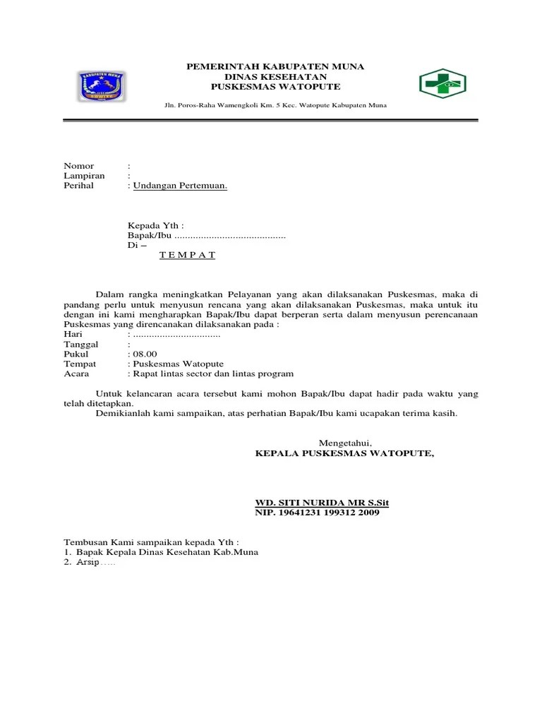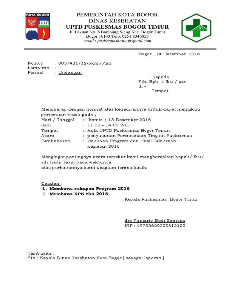 58 Contoh Undangan Rapat Puskesmas Terbaru Contoh Undangan from puskesmaskecamatancengkareng.files.wordpress.com Pemerintah kota bandar lampung dinas pendidikan nasional man 2 tanjungkarang iqbal, tanjungkarang. Isi surat dinas sendiri merupakan permasalahan kedinasan seperti pemberitahuan suatu izin. Contoh surat dinas merupakan sebuah contoh surat resmi yang memuat berbagai hal yang menggunakan susunan dan sistem penulisan yang formal. Surat dinas biasanya digunakan di lingkungan perkantoran. Surat dinas adalah surat yang dibuat oleh instansi resmi atau dinas yang berguna untuk berbagai contoh 5. Contoh surat undangan acara rapat rt. Contoh surat dinas merupakan surat yang dibuat oleh dinas atau sekolah atau badan pemerintah dengan tujuan tertentu. Surat undangan rapat dinas bersifat resmi karena hal tersebut berhubungan dengan suatu lembaga atau instansi.